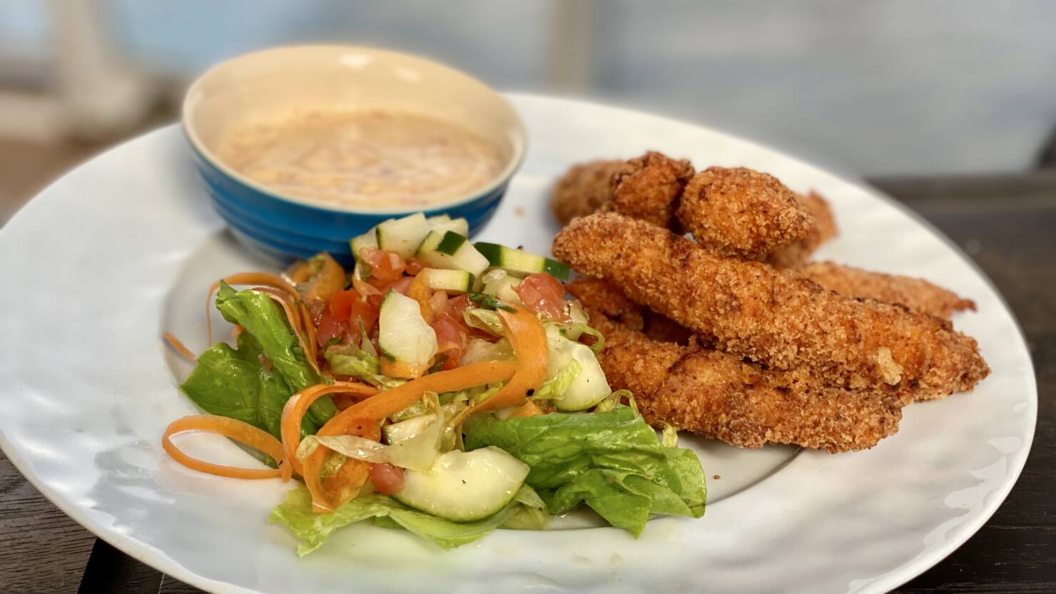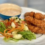 Chicken tenders m. salat + mayo 20 stk kyllingeinderfileterOlie til fritureTil marinade:4 dl kærnemælk1 spsk…