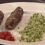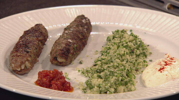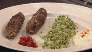 Köfte kebab Adam Price anretter en lækker tallerken med köfte kebab, bulgursalat, yoghurtdressing og chilirelish.…